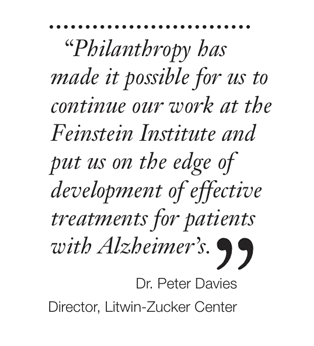 With the goal set on developing a truly effective treatment to prevent the onset of Alzheimer’s, philanthropic support makes it possible for scientists at the Litwin-Zucker Center to have the necessary resources to perform tests and make discoveries. Dr. Davies explains that the field as a whole right now is incredibly exciting and he is optimistic that “something is going to break soon.” The advances and knowledge, particularly over the past five years, have yielded promising results in the effort to develop a drug that will lengthen the time of protection, thereby stopping the progression of Alzheimer’s. Dr. Davies affirms, “No one group will solve Alzheimer’s, but through the long-term support of donors, we can continue to be a major contributor to the understanding of this disease and develop new therapies to treat patients.”